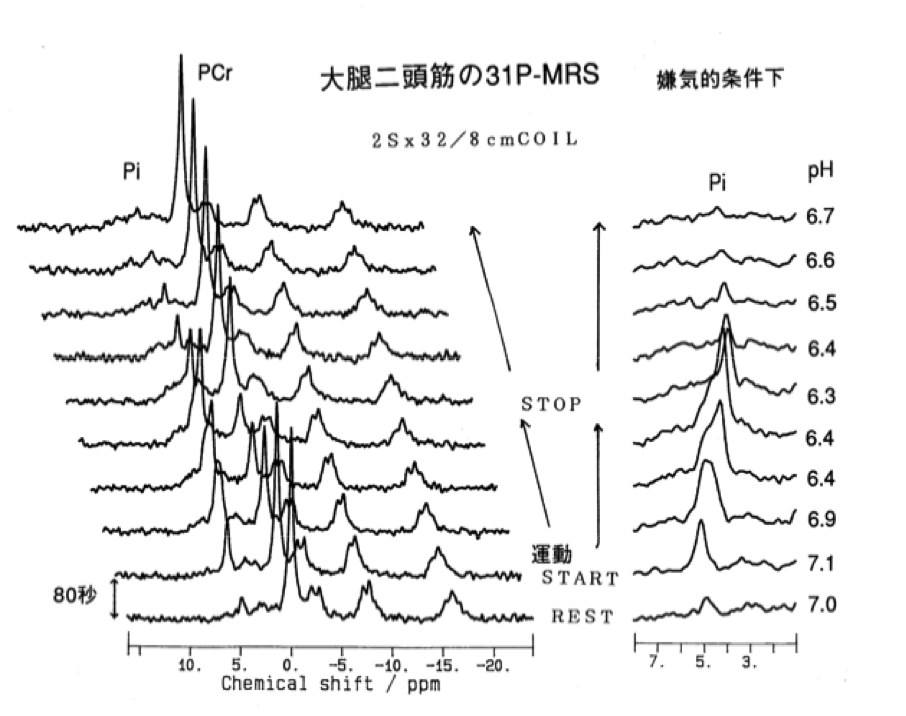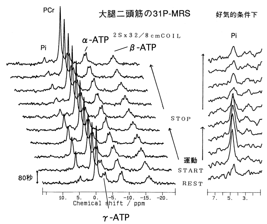 運動中の骨格筋代謝を31P-MRSで追跡した。測定条件TR=2s, 32回積算、大腿四頭筋を非選択(直径8cm surface coil利用) で計測した連続スペクトル。1.5Tで計測。