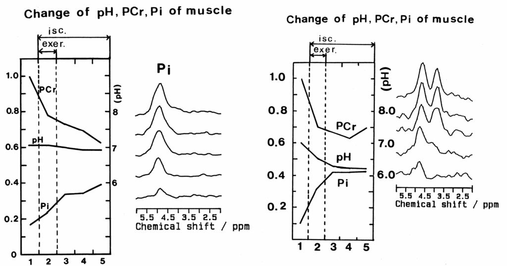 好気的条件下の運動による変化。好気的条件かではPCrの減少、無機リン酸の上昇が認められるが、ATPの減少、pHの低下は認められなかった。