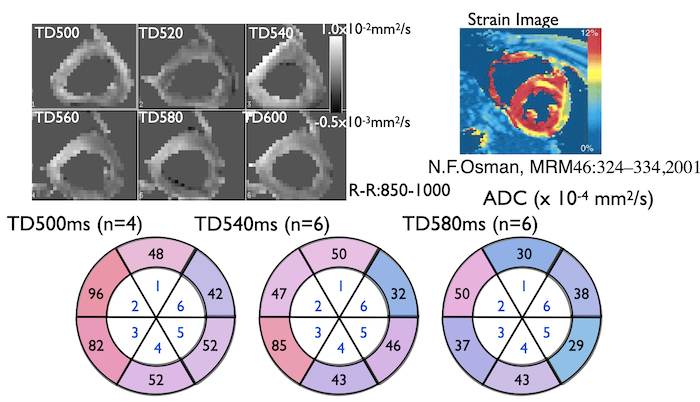 bipolar gradient pulse sequenceを用いて心筋拡張期の心筋のADCを計測するとstrain imageで得られる結果と似た、左心室の不均一な筋収縮が観測された。