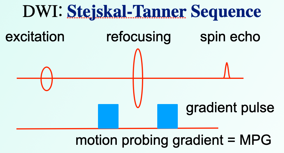 拡散強調画像はreforcusingのためのπパルス(180°)の両側にMPG(motiono proving gradinet)パルスを配置して、水のバルクフローでは信号が低下しないが、拡散のような水分子のinchoherent(自己相関のない動き)で信号が減少することで、拡散速度によってMRIコントラスを付ける手法である。この画像をdiffusion weighted image (DWI)と呼んでいる。