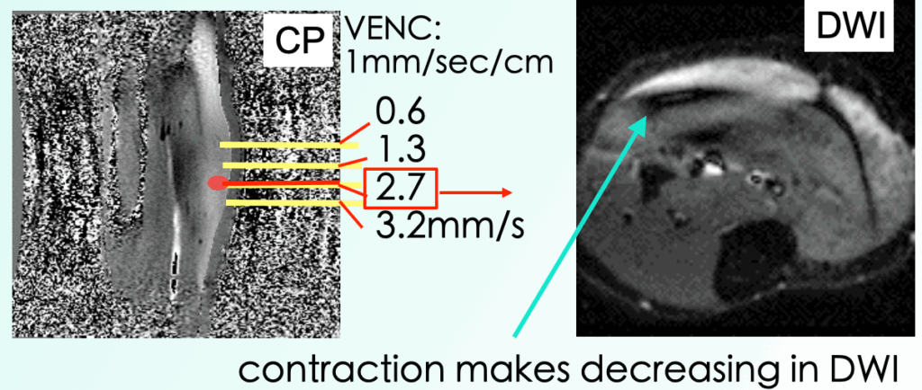 骨格筋を通電収縮させたとき、sagital phase contrast MRI(右)の画像から組織の収縮が計算できる。一方、axial DWI(左)ではPC (phase contrast) MRIで収縮速度を計測した。収縮している筋ではDWIで信号低下が認められる。