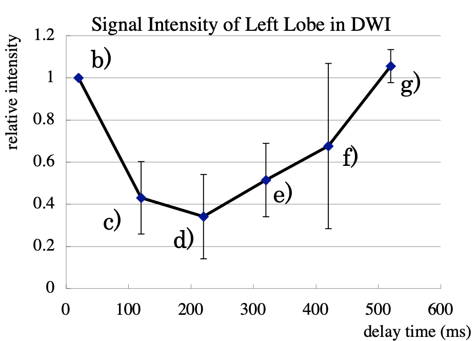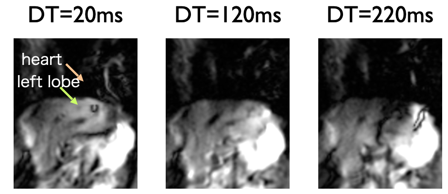 DWIで信号が欠如する他の組織として心筋、肝左様が報告されている。肝左様も心臓の動きに対して信号の欠如が報告されており、心拍に同期してDWIの信号欠如が心拡張に最大低下を示す。TDはR波からの遅延時間であり、220ms付近で最大の信号低下を示した。最大拡張のタイミングは300ms程度であるが220msは変形速度が大きい時点かもしれない。
