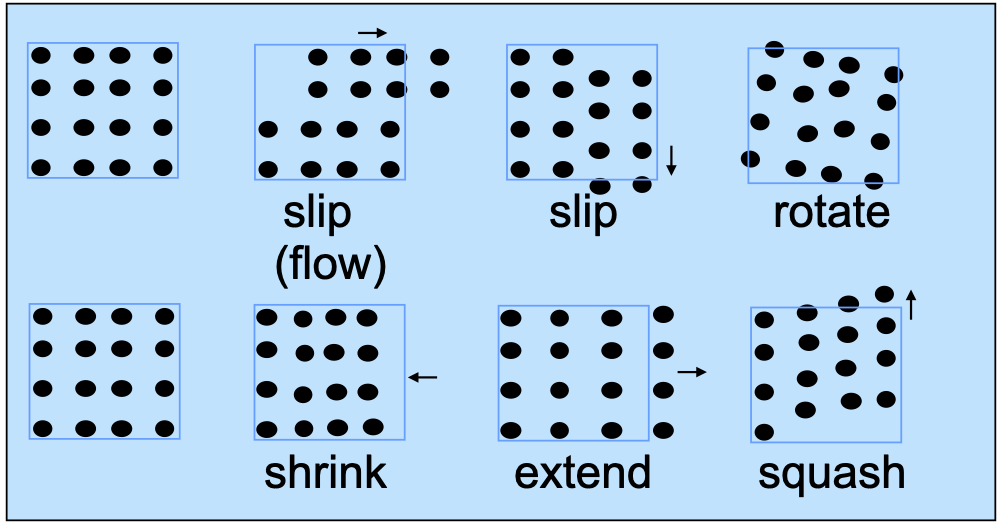組織が歪むときには、水移動を伴わない歪みでもIVIMが達成され、DWIの信号低下を招く。下の図で青い四角がMRIのボクセルであり、黒丸が水分子を表している。四角の中でinchoherentな水分子の移動が生じるとDWIの信号が低下が生じると考えられる。